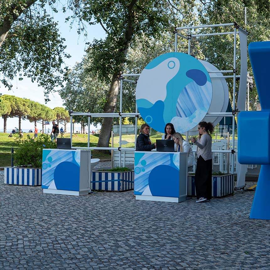 Inspired by the movements of the waves, their texture and color and the brilliant harmony in this blue universe, this social networking event was relaxed and cheerful in order to inspire the international participants. It featured a café area for networking and the Sophia de Mello Breyner Room for the conference, organized by Tobias Troll.